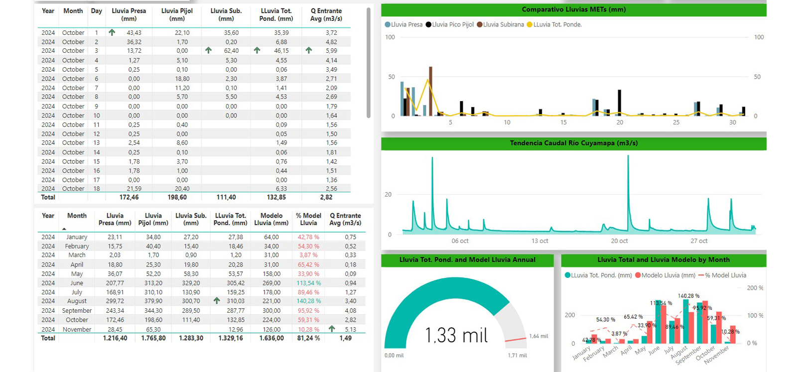 Desde aquí gestionamos en tiempo real procesos clave como el monitoreo y análisis de recursos críticos como agua, viento y energía solar, además del control de fallas y maniobras esenciales. Esto asegura la continuidad operativa, optimiza el rendimiento de las plantas y permite una respuesta inmediata ante emergencias, minimizando interrupciones en la generación.